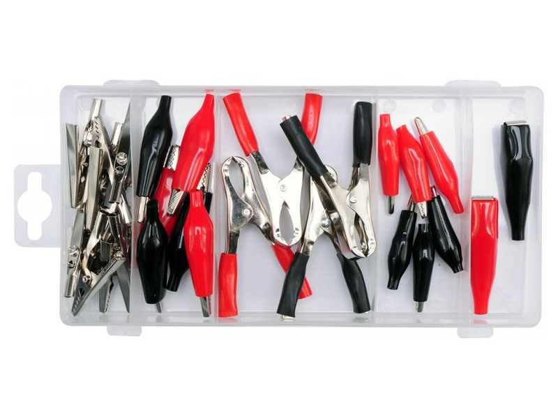 Egy szett elektromos krokodilok. A csomagolás tartalma 28 különböző méretű krokodil, szigetelt és nem szigetelt darabok. Az egész egy praktikus "válogató" csomagolásban található.
