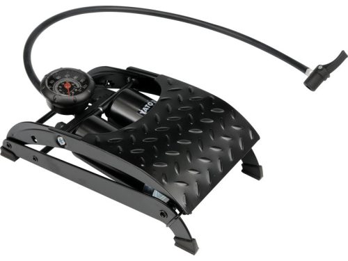 Szilárd dupla-lemezes lábpumpa, 3 mm vastag préselt, lakkozott acéllemezből készült. Egy nyomásmérő, amely 7 bar-ig olvasható. - dupla-lemezes lábpumpa - adapterek - 2 darab (matracok, labdák stb. felfújásához)