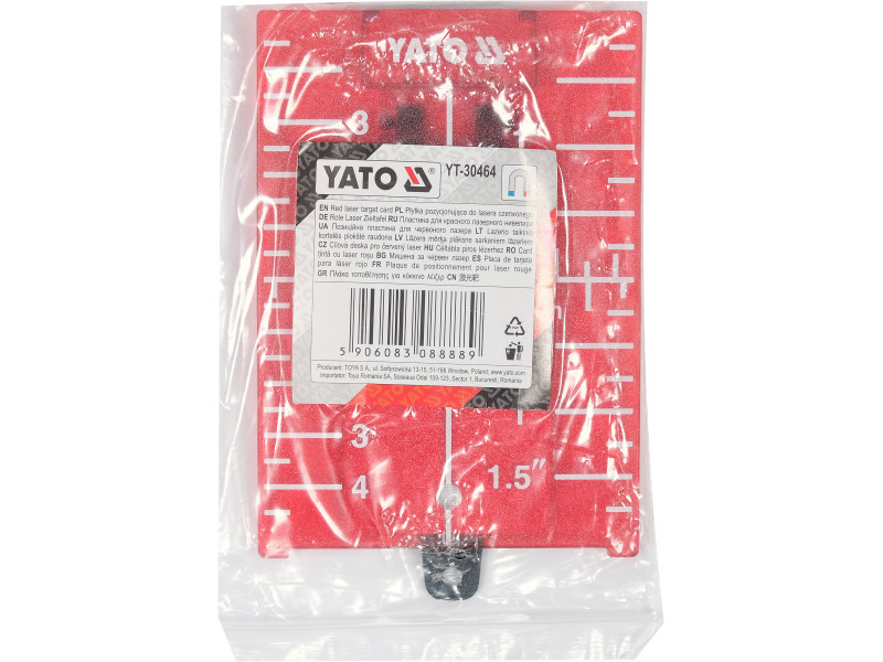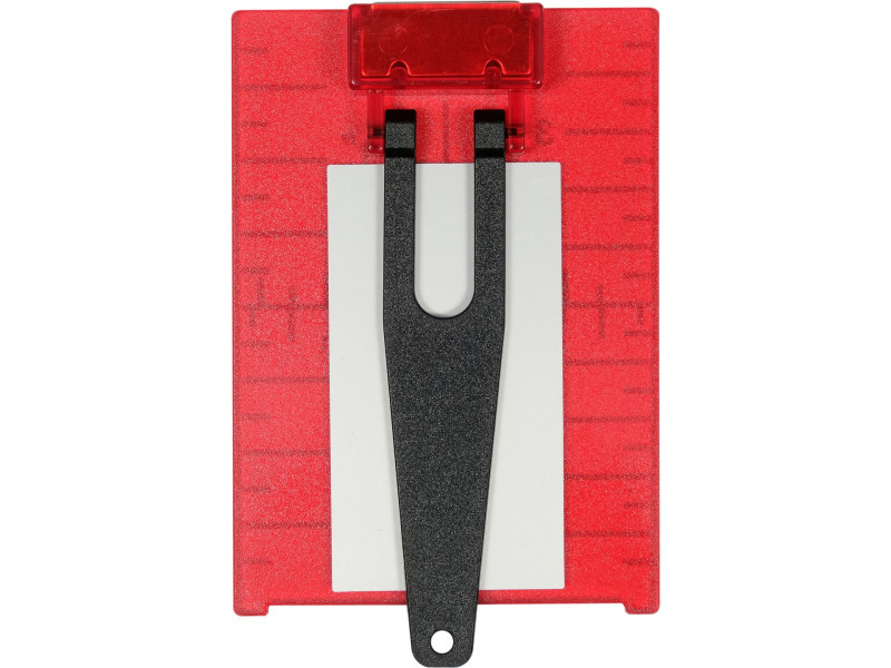Piros lézeres céltábla. értelmes metrikus (5 mm osztás) és imperiális (1/4" osztás) hátsó támogatás és mágnes a célpont beállításához méret: 75 mm x 105 mm vastagság: 3.2 mm