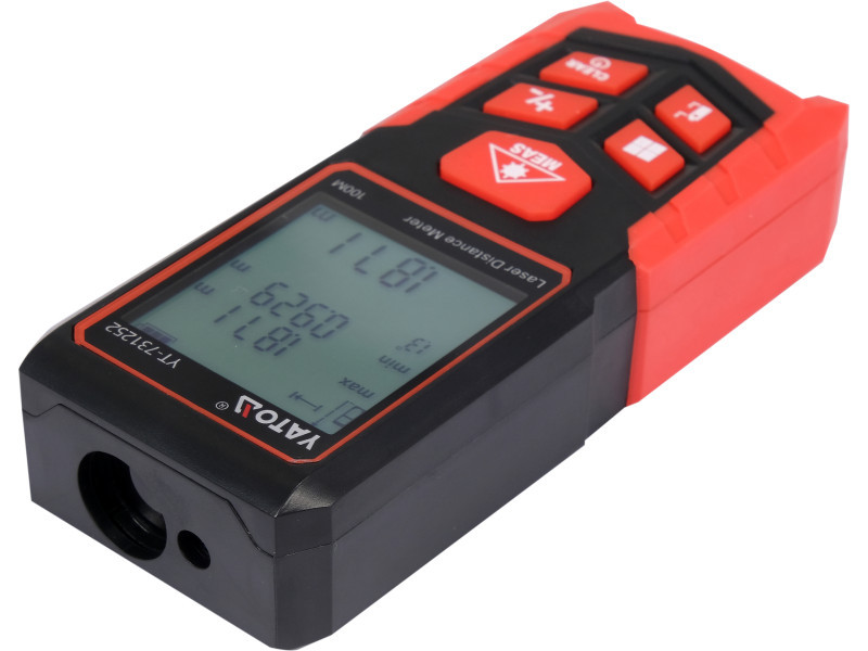 Lézeres távolságmérő gyors és pontos távolságmérésekhez 0,05-től 100 méterig. Belső távolság- és térfogatmérésekhez. Kalibrációs funkcióval és kényelmes hordtáskával rendelkezik. Funkciók: pont- és folyamatos mérés felület- és térfogatszámítás 3 féle mérés Pitagorasz tételének alapján memória 99 eredményhez változtatható mérési kezdőpont mérési egységek váltása folyamatos dőlésszög mérés távolságmérés közben automatikus lézer kikapcsolás 30 másodperc után a távolságmérő automatikus kikapcsolása 180 másodperc után kalibráció További információk: nagy, könnyen olvasható LCD kijelző akkumulátor állapotjelző erősített ház Tápellátás: 2 AAA elem *A YT-731252 távolságmérő optikája nem képes rögzíteni a lézersugarat teljes napsütésben a szabadban. Szabadtéri mérések lehetségesek alkonyat után vagy éjjel.