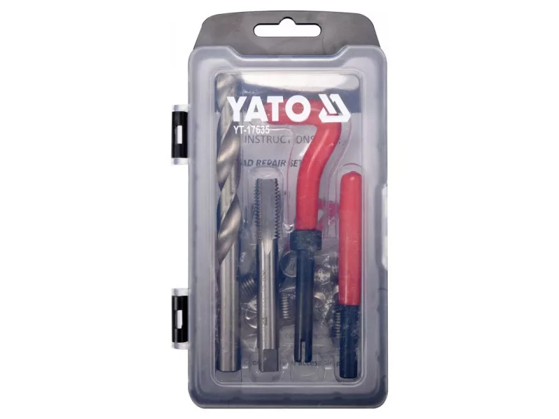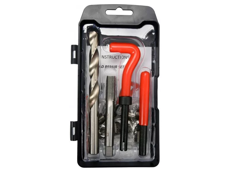 Az elromlott menetek újraépítésére tervezve. A készlet elemei strapabíró rozsdamentes acélból készültek.