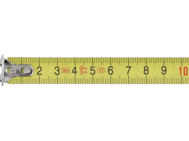 Mértékszalag 3 m x 16 mm   kazetta ABS műanyagból készült, csúszásgátló alkalmazásokkal fekete gumi szalag 16 mm széles rugalmas acéllemezből készült sárga színű szalag, jól olvasható milliméteres beosztással a felületet nylon bevonat védi a szalag kopásától és a napfény hatására történő elszíneződéstől egy masszív, mozgatható, mágneses horggal végződik a szalag II. osztályú pontossággal készült   Gyors, pontos méréshez.
