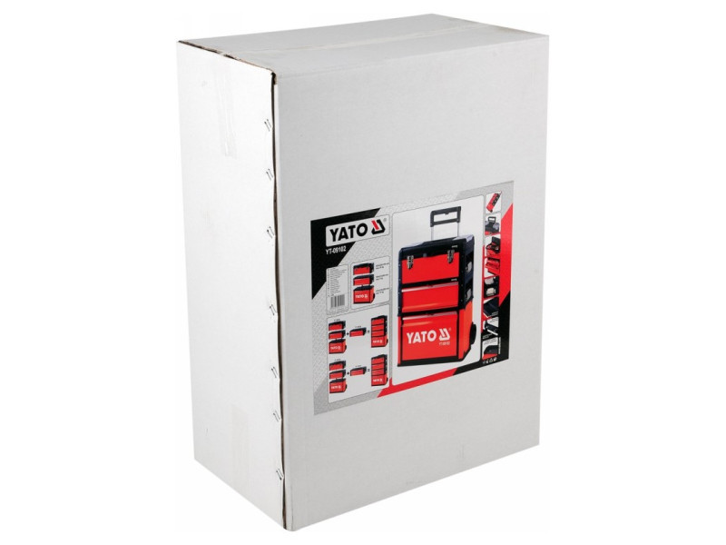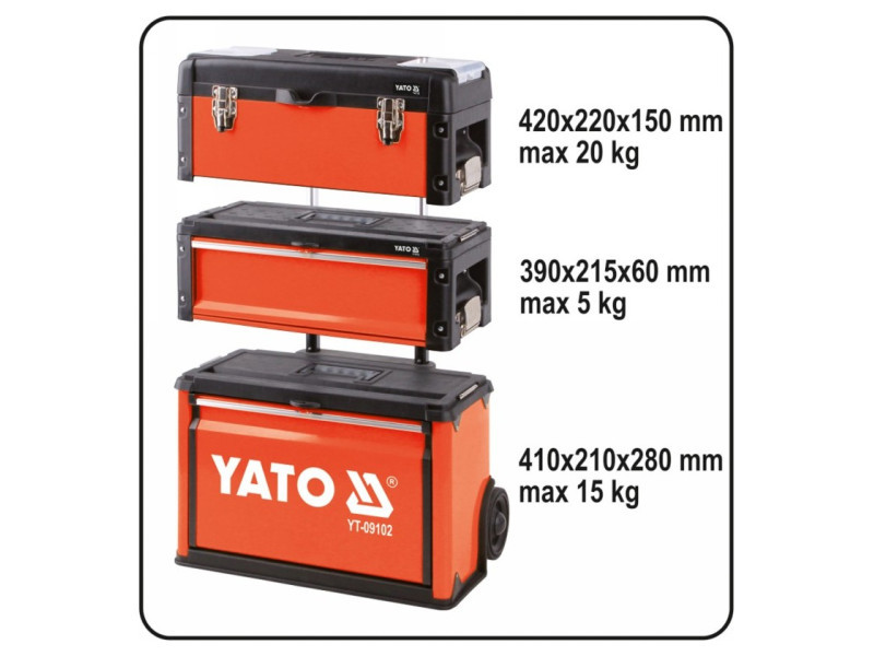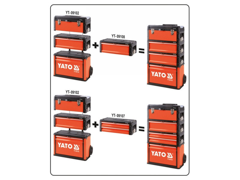 Moduláris 3-részes szerszámos szekrény. A készlet tartalmaz egy alsó dobozt beépített kerekekkel, kihúzható alumínium fogantyúval és egy nagy, kihúzható fiókkal. Az alsó modul teherbírása 15 kg, méretei 410x210x280 mm. A középső modulban található 1 fémből készült fiók, amelynek teherbírása 10 kg, méretei pedig 390x215x130 mm. A fiók golyóscsapágyas fém sínre van szerelve. A felső modul egy klasszikus szerszámosláda, méretei 420x220x150 mm, teherbírása 20 kg. Beépített 2 kihúzható szervezővel és szerszámtálcával rendelkezik. A modulok teteje lapos, amelyet munkafelületként is lehet használni. Ezen kívül rendelkeznek egy nagyon hasznos horonnyal fúrás vagy csavarozás céljából. Emellett a moduloknak kényelmes csúszásgátló fogantyújuk, oldalsó fogantyújuk a könnyű emeléshez és csúszásgátló alsó sarkuk van.Lehetőség van a 3-modulos készlet 4 modulossá bővítésére a YT-09107 vagy YT-09108 középső modul hozzáadásával. A fő és középső modulokon fémszerelvények vannak a készletek összekapcsolásához, az alumínium fogantyú pedig további zárral rendelkezik a modulok rögzítéséhez. A YATO szerszámtálcákba előre elkészített szerszámkészleteket lehet betenni.