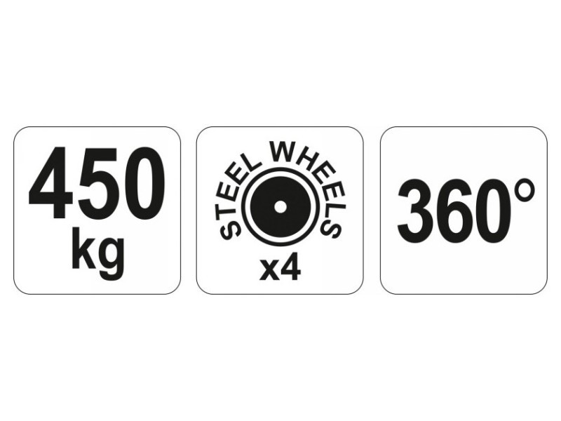Motorkezelő állvány 450 kg-ig terhelhetőséggel. Négy fém kerékkel rendelkezik - ebből kettő csavart, hogy megkönnyítse a manőverezést. A forgó fej négy állítható mancssal lehetővé teszi a motor biztonságos pozicionálását a 360 fokban.