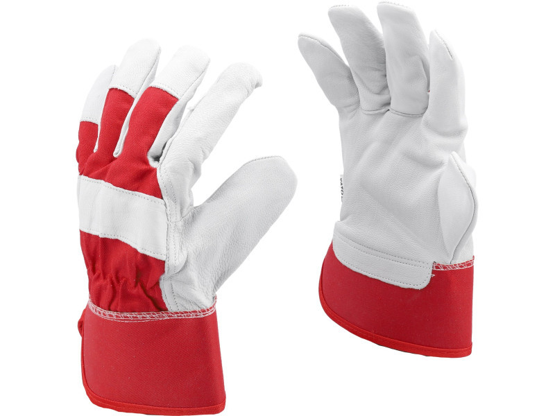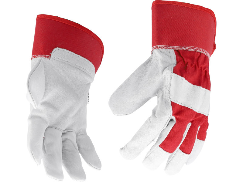 Természetes bőrből és piros színű, pamut kötött anyagból készült építőipari kesztyűk. A kecske szemcsés bőr magas minősége nagyon kellemes tapintást biztosít a kesztyűnek, és a kezek nem izzadnak túlzottan. Kiválóan használhatóak nehezebb építési munkáknál, a kertben, valamint bárhol, ahol nem szükséges a nagypontosságú fogás. fogó rész: természetes szemcsés bőr felső rész: bőr és pamut kötött anyag mandzsetta: laminált pamut kötött anyagból.