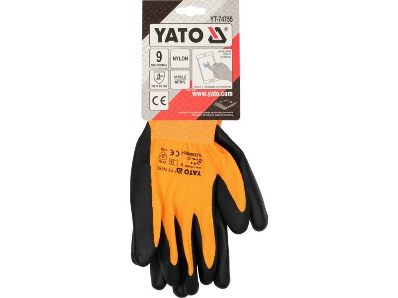 Munkavédelmi kesztyűk készültek sűrűn varrt narancssárga nylonból, a fogás részét fekete habosított nitrill borítja, amely speciális adalékanyagot tartalmaz, amely lehetővé teszi az érintőképernyős eszközök, mint például okostelefonok és táblagépek simán működését. A nitril ellenáll a benzinnek, dízel üzemanyagnak, paraffinnak, a legtöbb oldószernek és kenőanyagnak. A habosítási folyamat javítja a tapadást nedves és enyhén olajos felületeken. A varrat nélküli nylon konstrukció jó ellenállást biztosít a műhelyben használt vegyszerekkel szemben és hosszabb ideig őrzi meg a rugalmasságát, mint a poliészter társai. A kesztyűk nem nyúlnak ki az idő múlásával és még sok hetes munka után is jól tapadnak. A finom 15G varrás, vagyis 15 öltés hüvelykenként, jobb illeszkedést biztosít a kézben, ami pozitív hatással van a precíziós munkára. Fogórész: nitril bevonat, hab típusú felső rész: nylon varrás: 15G rugalmas mandzsetta Érintőképernyős támogatás okostelefonokhoz: A napjainkban legnépszerűbb okostelefon érintőképernyős technológia az elektromos mező változásának jelenségét használja. A nagyon precíz működés, a finom gesztusok a nagy nyomás helyett, mindennapi kényelmet jelent minden felhasználónak. A helyzet más azok számára, akik hagyományos bevonatos kesztyűkkel dolgoznak, amelyek kialakításuknál fogva korlátozzák az elektromosság áramlását, és így korlátozzák az elektromos mező változásait. Ekkor az okostelefon kezelése nehézkessé, sok helyzetben lehetetlenné válik. A YATO bevonatos kesztyűinek kialakítása egy speciálisan adagolt bevonattal visszaállítja az elektronok áramlását, így lehetővé teszi az érintőképernyők akkorát működését, mintha nincs kesztyű a kézen.