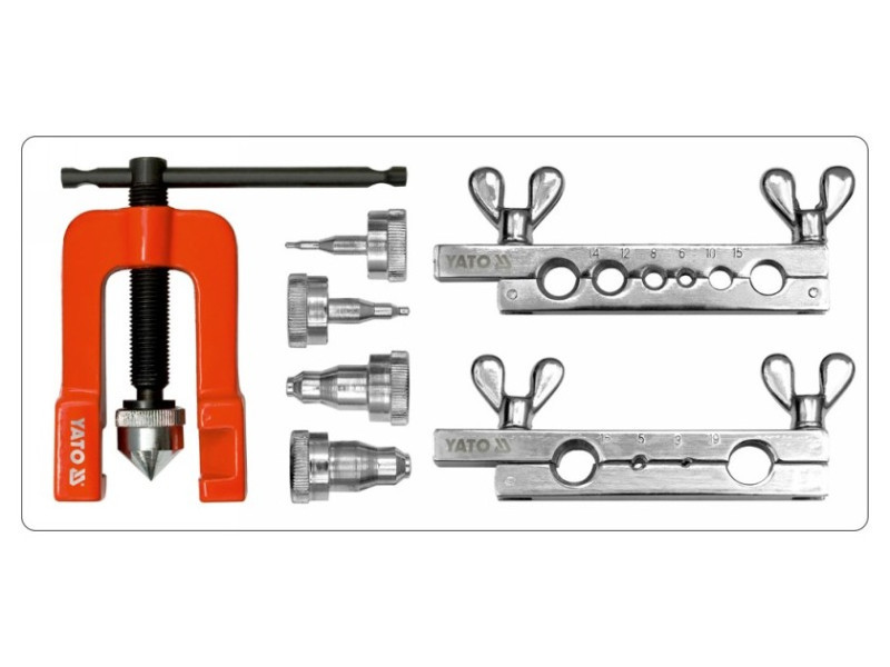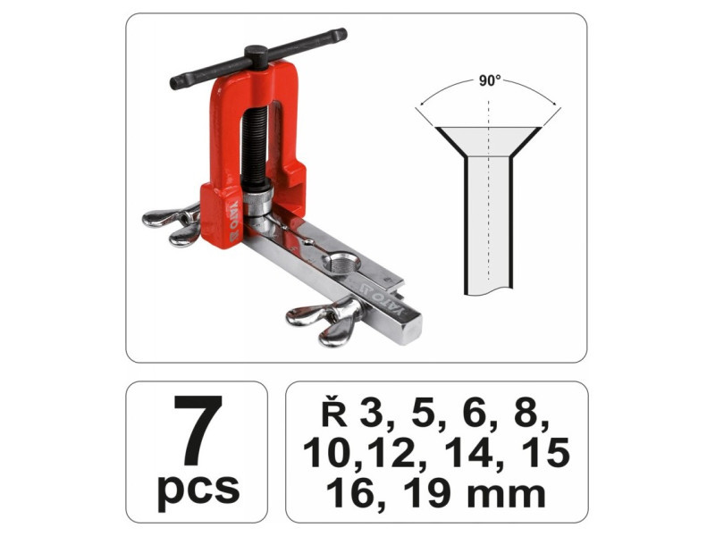 Csőtágító prés 3-19 mm-es csövek kézi tágításához és 90°-os kúpos csatlakozó flanszok készítéséhez.Alkalmazás:Fűtés, légkondicionálás, fékberendezések. Használati figyelmeztetések: A kéziszerszámok használata veszélyes lehet! Mindig használjon személyes védőfelszerelést munka közben. Csak megfelelő és sérülésmentes szerszámokat használjon. Válassza ki a szerszám típusát és méretét a tervezett alkalmazás szerint. Ne terhelje túl a szerszámokat. Tartsa a szerszámokat távol a gyermekektől. Gondosan használja a szerszámokat.