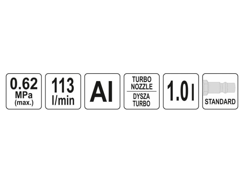 Pneumatikus habosító gép mosószer tartállyal, ami lehetővé teszi a felületek aktív habbal történő hatékony tisztítását. Autókarosszériák, autó- és kamion utánfutók, autóalkatrészek és egyéb összetevők tisztítására tervezték, amelyek ellenállnak az aktív habbal történő mosásnak.könnyű és tartós alumíniumból készülttartálykapacitás: 1 lmaximális működési nyomás: 0,62 MPalevegőfogyasztás: 113 l/perca szelep váltó lehetővé teszi a folyadék szívásának szabályozását a tartálybólstandard csatlakozása turbofúvóka vastag és száraz habot hoz létre, ami tovább tart a tisztított felületena széles csúcs megkönnyíti a hab nagyobb területekre történő felvitelét, pl. külső mosásakor