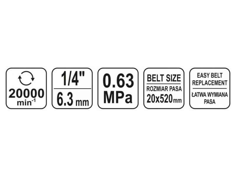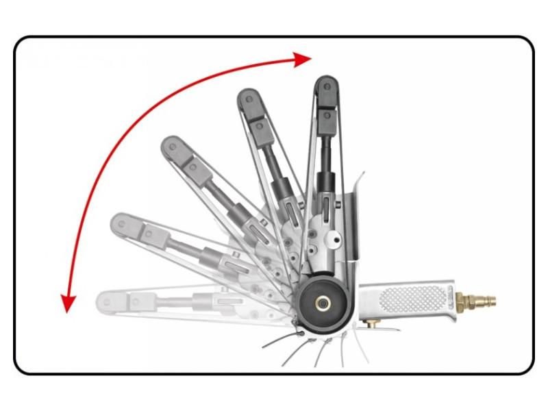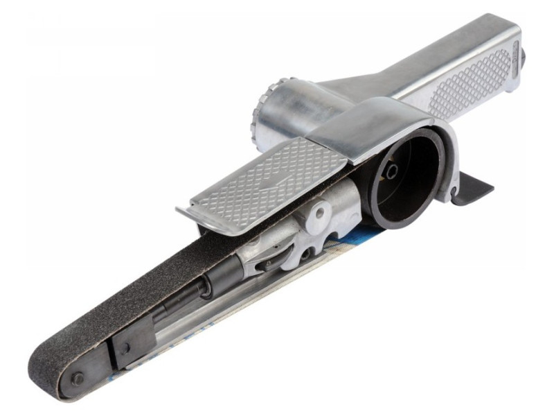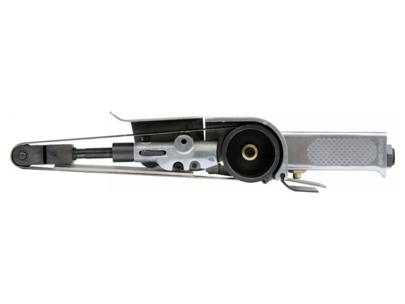 Professzionális szalagos pneumatikus csiszoló. Szalag mérete 20x520 mm, munkasebesség 20,000 ford/perc. Légtartály csatlakozás 1/4 ". Állítható munkafej.