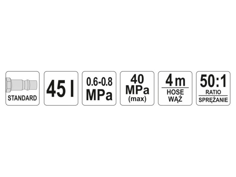 Teljesítmény YATO pneumatikus zsírszóró autószerelő műhelyekben, mezőgazdaságban, iparban való használatra. Úgy tervezték, hogy gépeket és berendezéseket karbantartsanak, melyeknek van egy vészhelyzet kenőrendszerük. Kompresszorra csatlakoztatva önálló működést tesz lehetővé, második személy segítsége nélkül.Nyomás a pumpánál 8 bar tömörített levegőnél: 300-400 bartömörítési arány: 50:1nagy zsírtartály: 45 lfém pisztollyal zárvarugalmas cső, 4 m hosszúságbankerekek a könnyű szállítás és manőverezés érdekében Kenőanyag-adagoló, nyomócső, zsírszóró pisztoly, pótalkatrészek