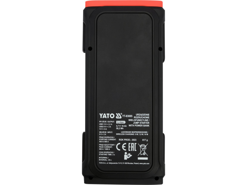 indítóáram: 400, 800 A csúcsbeáramlás: 800, 1000 A indítási idő: 2 s feszültség: 12 V  USB aljzat kimeneti feszültség: 5 (1), 9 (2) V DC aljzat maximális kimeneti árama: 8 A akkumulátor kapacitás: 16 Ah akkumulátor energia: 59.2 Wh akkumulátor feszültség: 3.7 V akkumulátor típus: Li-Ion töltési idő: 4 h töltő: hálózati 110-240V, autós 12V, vezeték nélküli töltés vezeték nélküli töltés: 5, 7.5, 10 W zseblámpa funkció fény mód: 100%, SOS LCD kijelző Működési hőmérséklet tartomány: 0~40 °C tárolási hőmérséklet: 0~50 °C súly: 0.62 kg