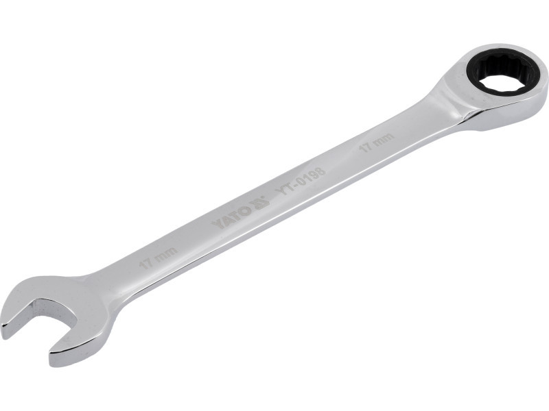 Racsni kulcs 17 mm-es racsnival. a kulcs kiváló minőségű CrV6140 szerszámacélból készült, ezen felül krómozott és polírozott felületi kivitel a szerszám 72 fogú racsnival van felszerelve, amelynek lyuka egy speciálisan alakított tizenkétoldalú alakzat a jobbra és balra fordulás lehetősége, valamint a minimális munkaszög 5 fok lehetővé teszi, hogy ki tudjuk csavarni a nehezen hozzáférhető helyeken lévő csavarokat, és csökkenti a munkaidőt a kulcsciklusban lévő 2 mozgás kiküszöbölésével autószerelő műhelyekben és szervizüzletekben történő használatra tervezték