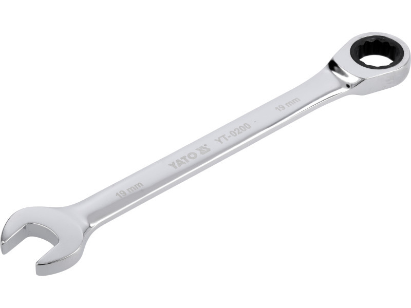 19 mm-es rögzítő kombinált kulcs racsnival. a kulcs CrV6140 minőségű szerszámacélból készült, felülete krómbevonatú és polírozott a szerszám 72 fogú racsnival van felszerelve, amelynek szeme különleges, tizenkétoldalú alakú a jobb és bal irányú fordulatok, valamint a minimális munkaszög 5 fok lehetővé teszi a nehezen hozzáférhető helyeken lévő csavarok kicsavarását és csökkenti a munkaidőt a kulcsciklusban lévő 2 mozgás kiküszöbölésével autószerelő műhelyekben és szervizekben történő használatra tervezték