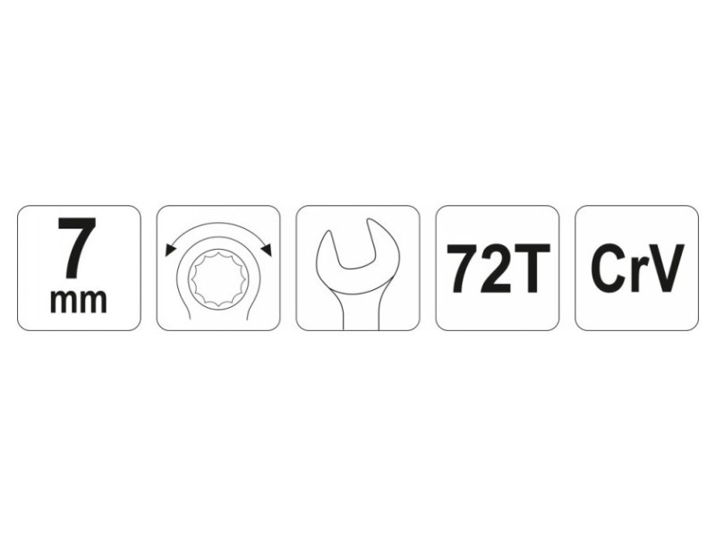 7mm-es racsnis kombinált kulcs. a kulcs CrV6140 szerszámacélból készült, továbbá felülete krómozott és polírozott a szerszám egy 72 fogú racsnival van ellátva, amelynek szeme egy speciálisan alakított tizenkétoldalú formájú a jobbra és balra fordítások lehetősége és a minimális munkaszög 5 fok lehetővé teszi, hogy nehezen hozzáférhető helyeken csavarhúzókat használjon, és csökkenti a munkaidőt a kulcsciklusban lévő 2 mozgás kiküszöbölésével autószerelő műhelyekben és szervizboltokban való használatra tervezték