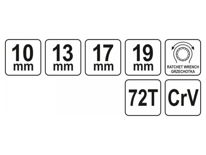 Kétoldalú csillagkulcs racsnival, tartós króm-vanádium acélból készült. A kétoldalú kulcs kialakításának köszönhetően négy méretet használtak: 10; 13; 17 és 19mm. A racsni 72 fogú. A felület krómmal van bevonva. A kulcson irányváltó kapcsoló található. Szakosított autós és mechanikai szolgáltatások számára fejlesztették ki.