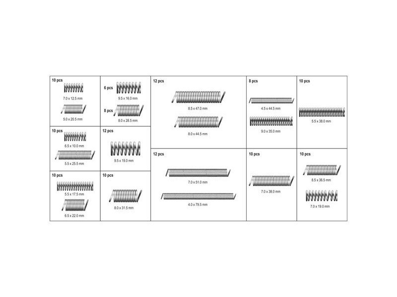 Rugókészlet, mely 200 különböző méretet tartalmaz. A rugók mind nyomó, mind húzó műveletekre alkalmasak. Az egész egy kényelmes "válogató" csomagolásban helyezkedik el.