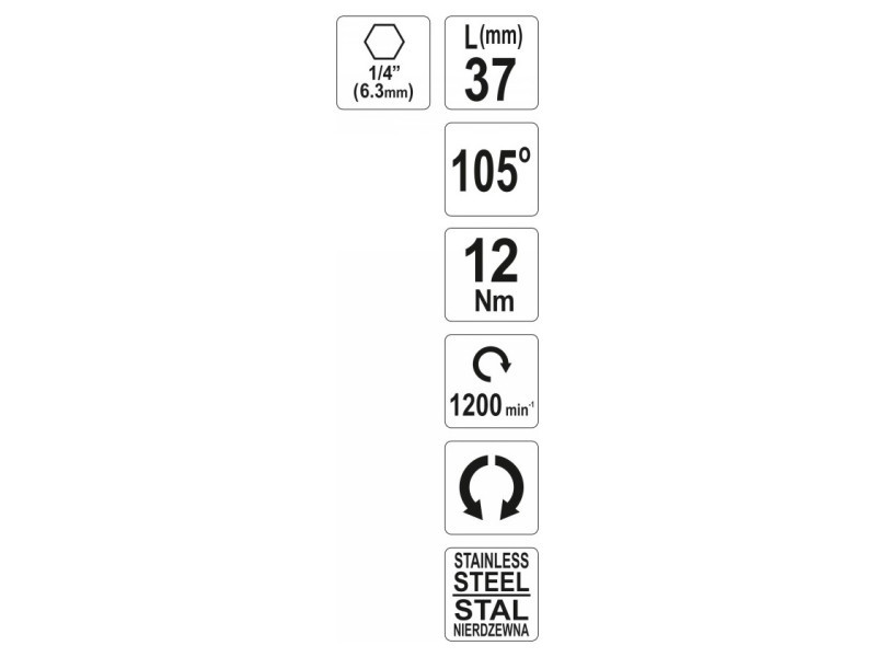 Szögadapter Yato YT-04632 márkájú hajtóművel. Használható nehezen elérhető helyeken végzett munkák során. Szénacélból készült Maximális nyomaték: 12 Nm. Maximális RPM: 1200 rpm mágneses fogás hatszögletű dőlési szög: 105° hossza: 37 mm Használati figyelmeztetések: Figyelem! Mindig használjon személyes védőfelszerelést munka közben.