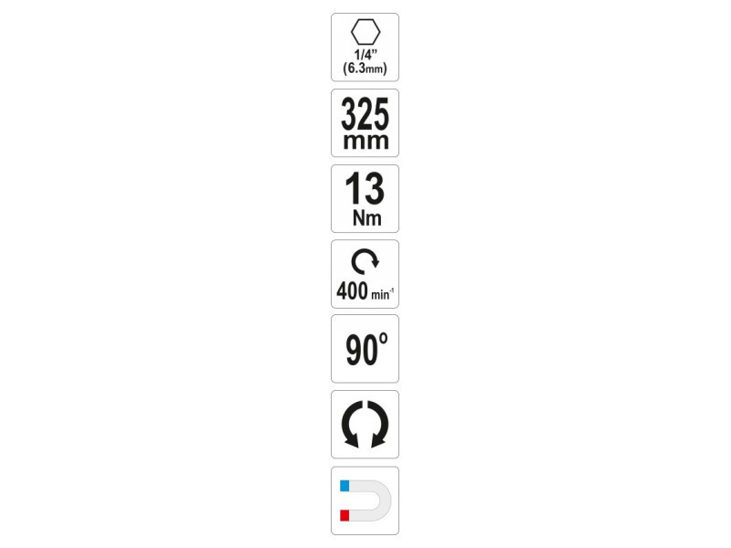 YATO YT-04636 márkájú hex adapter hosszabbítóval. Mágneses bit adapter hosszabbítóval, amely elengedhetetlen a nehezen elérhető helyeken végzett munkáknál. Golyóscsapágyas sebességváltóval rendelkezik és mindkét irányban képes a forgásirány megváltoztatására. Szénacélból készült, krómozott felület Hosszabbító hossza 325 mm Maximális nyomaték: 13 Nm maximális fordulatszám: 400 rpm dőlési szög: 90° mágneses rögzítés hex 1/4" Használati figyelmeztetések: Figyelem! Munka közben mindig használjon személyes védőfelszerelést.