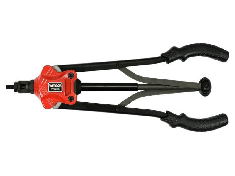 YATO YT-36125 M3-M12 kézi szegecsológép szegecsmutterekhez. A szegecsológép anyagok szegecsmutterekkel történő összekötésére szolgál. Belső menetes burkolatokkal köti össze az anyagokat. Lehetővé teszi további részek lemezcsavarokkal vagy csavarokkal történő csavarását. A fejek méretei: M3, M4, M5, M6, M8, M10, M12, tartós CRMO króm-molibdén szerszámacélból készültek. A fogantyúk csúszásgátló gumi borítással vannak ellátva. A gép teste alumíniumból készült. A szegecsológép rendelkezik gyorskioldó rendszerrel a szegecsmutterek munka befejezése utáni eltávolításához.