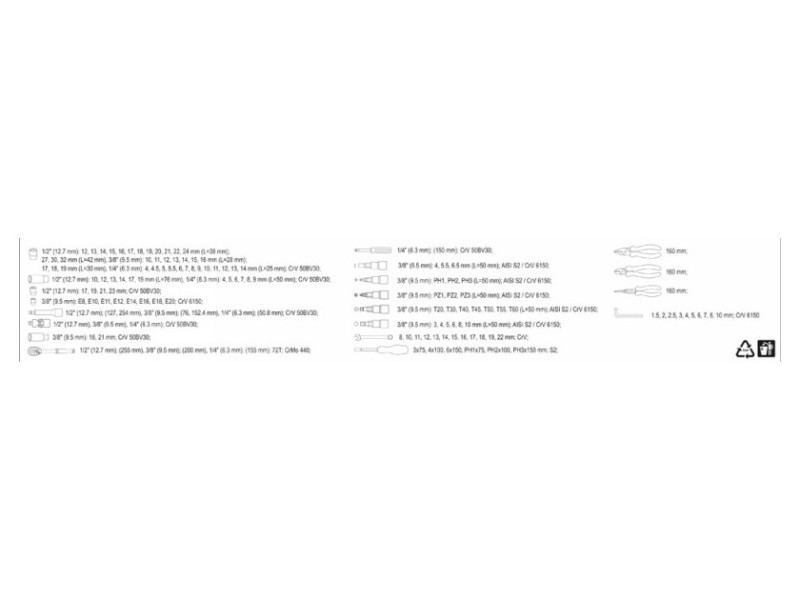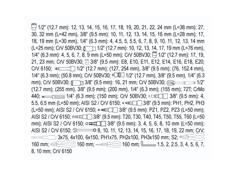 A Yato eszközkészlet 129 darabból áll, melyek egy praktikus műanyag dobozban vannak elhelyezve. Az eszközök megbízható anyagokból készültek, pontosságuk garantált.A készlet hasznos lehet szerelési munkák, gépjavítások és sok más háztartási vagy műhelymunka során.A készlet tartalma:1/2" foglalatok, L= 38/42mm, CrV 50BV30: 12, 13, 14, 15, 16, 17, 18, 19, 20, 21, 22, 24, 27, 30, 32mm3/8" csavarkulcsok, L= 28/30mm, CrV 50BV30: 10, 11, 12, 13, 14, 15, 16, 17, 18, 19mm1/4" csavarkulcsok, L= 25mm, CrV 50BV30: 4, 4.5, 5, 5.5, 6, 7, 8, 9, 10, 11, 12, 13, 14mmHosszú foglalatok 1/2", L= 76mm, CrV 50BV30: 10, 12, 13, 14, 17, 19mmHosszú foglalatok 1/4", L= 50mm, CrV 50BV30: 4, 5, 6, 7, 8, 9mmSpeciális foglalatok 1/2",CrV 50BV30: 17, 19, 20, 23mmTorx foglalatok 3/8", CrV 50BV30: E8, E10, E12, E14, E16, E18, E20L típusú Imbusz kulcsok", CrV 6150: 1.5, 2, 2.5, 3, 4, 5, 6, 7, 8, 10mmLapos végű kulcsok, CrV : 8, 10, 11, 12, 13, 14, 15, 16, 17, 18, 19, 22mmToldók 1/2", CrV 50BV30: 127, 254mmToldók 3/8", CrV 50BV30: 76, 152mm1/4" toldó, 50mm, CrV 50BV30Kardánjoints, CrV 50BV30: 1/2", 3/8", 1/4"Gyertyakulcsok 3/8", CrV 50BV30: 16, 21mmRatélszett 72 fogas, CrV 6140: 1/2", 3/8", 1/4"Nyéllel ellátott csavarhúzó 1/4", 150mm, CrV 50BV30SVCM55 laposfejű csavarhúzók: 3x75mm, 4x100mm, 6.5x150mmSVCM55 philips csavarhúzók: PH1 x75mm, PH2 x100mm, PH3 x150mm3/8" pengéjű csavarhúzók, CrV 50BV30 / AlSi S2 laposfejű: 4.0, 5.5, 6.5mm3/8" pengéjű foglalatok, CrV 50BV30 / AlSi S2 philips: PH1, PH2, PH33/8" pengéjű foglalatok, CrV 50BV30 / AlSi S2 pozidrive: PZ1, PZ2, PZ33/8" pengéjű foglalatok, CrV 50BV30 / AlSi S2 torx: T20, T30, T40, T45, T50, T55, T603/8" pengéjű foglalatok, CrV 50BV30 / AlSi S2 imbusz: 3, 4, 5, 6, 8, 10Hosszú orrú fogó, 160 mm, CrV 55Vágófogó, 160 mm, CrV 55Kombinált fogó, 180 mm, CrV 55" Használati figyelmeztetések: Figyelem! Mindig használjon személyes védőfelszerelést munka közben.