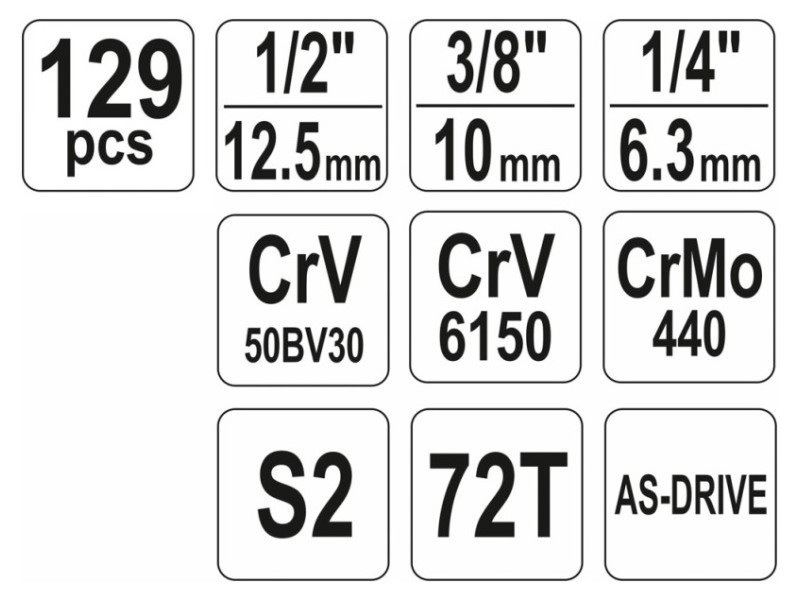 YATO Szerszámkészlet 129 részes 1/4", 3/8", 1/2" CrV CrMo
