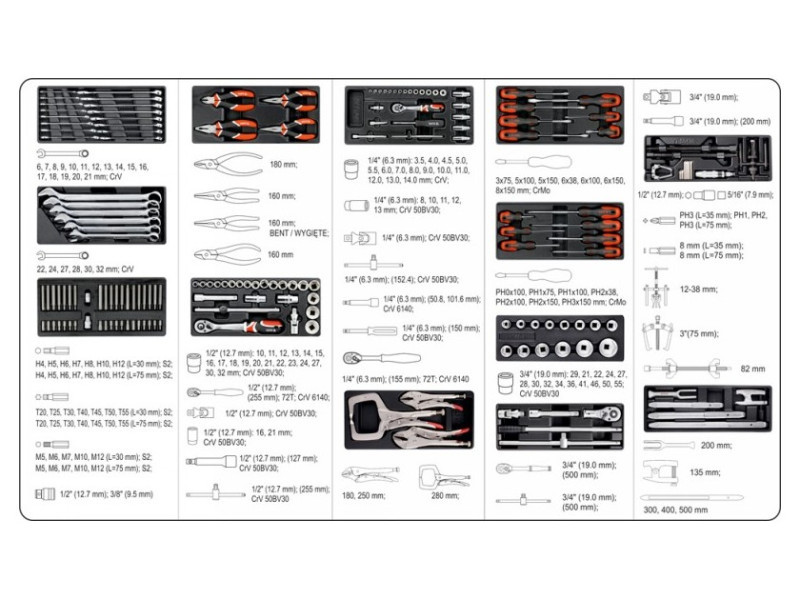 BETÉT 1: Lapos végű kulcsok YT-0335~YT-0350 (6, 7, 8, 9, 10, 11, 12, 13, 14, 15, 16, 17, 18, 19, 20, 21 mm) BETÉT 2: YT-0351~YT-0360 nyitott végű kulcsok (22, 24, 27, 28, 30, 32 mm) UTÁNTÖLTÉS 3: ADAPTER 1/2" & 3/8"; HEX bit, 30 MM (H4, 5, 6, 7, 8, 10, 12) & 75 MM (H4, 5, 6, 7, 8, 10,12) / TORX bit, 30 MM (T20, T25, T30, T40, T45, T50, T55) &. 75 MM (T20,T25, T30, T40, T45, T50, T55) / BORDÁS Bit, 30 MM (M5, 6, 8, 10, 12) &75 MM (M5, 6, 8, 10, 12) BETÉT 4: 1/2" hex dugókulcsok YT-1203~YT-1243 (10, 11, 12, 13, 14, 15, 16, 17, 18, 19, 20, 21, 22, 23, 24, 27, 30, 32 MM), racsni YT-0732 1/2", CRV 6140, 72T / YT-1247 hosszabbító 1/2" 127 MM / YT-1252 kardán csukló 1/2", YT-1253~YT-1254 gyertya dugókulcs 1/2", 16 MM, 21 MM, YT-1243 T-fogantyú 1/2" 255 MM BETÉT 5: 1/4" hex dugókulcsok YT-1401~YT-1412 (3.5; 4; 4.5; 5; 5.5; 6; 7; 8; 9; 10; 11; 12; 13; 14 mm), YT-1419~YT-1424 (8, 10, 11, 12, 13 MM), 1/4" hosszabbító, YT-1429 (50.8 MM) & YT-1431 (101.6 MM), YT-1437 1/4" kardán csukló, YT-1425 1/4" T-fogantyú, 152.4 MM, YT-0730 1/4" racsni, 72TH, CRV6140 BETÉT 6: YT-1941 univerzális fogó CR-V, 180 MM / YT-1943 hosszú egyenes fogó, CR-V, 160 MM, YT-1945 hosszú hajlított fogó, CRV, 160 MM/ YT-1947 oldalvágó fogó, CRV, 160 MM BETÉT 7: laposfejű csavarhúzók YT-2760 3x75 MM; YT-2763 5x100 MM, YT-2764 5x150 MM, YT-2765 6x38 MM, YT-2766 6x100 MM, YT-2767 6x150 MM, YT-2769 8x150 MM BETÉT 8: Phillips csavarhúzók YT-2771 PH0x100 MM; YT-2772 PH1x75 MM, YT-2773 PH1x100 MM, YT-2775 PH2x38 MM, YT-2776 PH2x100 MM, YT-2777 PH2x150 MM, YT-2779 PH3X150 MM BETÉT 9: présfogók YT-2452, YT-2453, YT-2468 BETÉT 10: 3/4" hex dugókulcsok 19 MM (YT-1301); 21 MM (YT-1302); 22 MM (YT-1303);24 MM (YT-1305); 27 MM (YT-1308); 28 MM (YT-1309); 30 MM (YT-1311); 32 MM (YT-1312); 34 MM (YT-1314); 36 MM (YT-1316); 41 MM (YT-1318); 46 MM (YT-1322); 50 MM (YT-1324); 55 MM (YT-1328) BETÉT 11: racsni 3/4 "X500mm (YT-1360); hosszabbító 3/4 "x200 MM (YT-1341); kardán csukló 3/4" (YT-1352); T-fogantyú 3/4 "x500 MM (YT-1350) BETÉT 12: csapágyhúzó (YT-2510); ütve csavarhúzó (YT-2802); rugó húzók (YT-2544); két karos húzó (YT-2515) BETÉT 13: kormányösszekötő húzó (YT-0615); gömbcsukló húzó (YT-0612); gumiabroncs vödör 500 MM (YT-0809); 400 MM (YT-0808);300 MM (YT-0807)