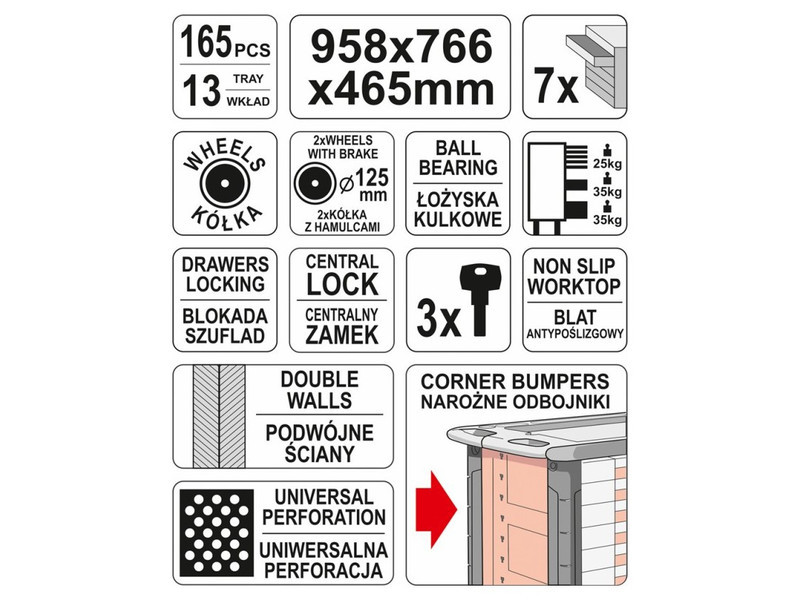 YATO márkájú szerszámosszekrény. 7 fiókkal rendelkezik, melyek golyóscsapágyas síneken futnak. Az 5 felső fiók 165 gondosan kiválasztott szerszámot tartalmaz. A profilokat víz alatti acéllemezből készítették - az univerzális perforáció lehetővé teszi a szekrény további tárgyakkal történő felszerelését. Központi zár és minden fiók egyéni zárása.