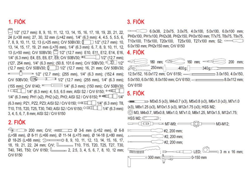 • Az első 5 fiók 211 gondosan kiválasztott szerszámot tartalmaz