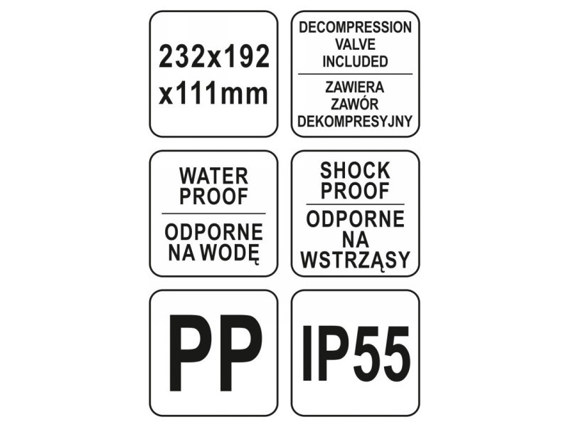 Hermatikus, vízálló és porálló koffer, amely ellenáll számos vegyi anyagnak és korróziónak. Rugalmas polipropilénből készült az IP55 ellenállási osztály szerint. Jellemzője az effektív tömítési rendszer, amelyet dekompressziós szelep egészít ki, amely a légközlekedés során a nyomáskiegyenlítésre szolgál. Lakattal zárható. A koffer belseje előre vágott szivaccsal van kitöltve, amelyet különféle termékek, például szerszámok, fényképezőgépek vagy mérőberendezések tárolására lehet formázni. A kofferek nagyszerűek, mint szoros és mechanikai sérüléseknek ellenálló tárolóeszközök, például vitorlázás, terepmotoros sportok esetén. stb. Az adott méretek a teljes külső méretek. A fal vastagsága kb. 10 mm.