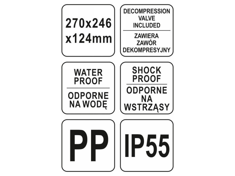 Hermetikus, vízálló és porálló doboz, amely ellenáll sokféle vegyi anyagnak és a korróziónak. A rugalmas polipropilénból készült, az IP55 ellenállósági osztály szerint.