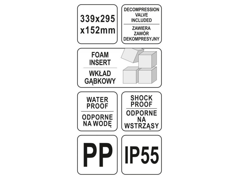 Hermatikus tok, vízálló és porálló, ellenáll számos vegyi anyagnak és korróziónak. Puha polipropilénből készül, az IP55 ellenállási osztály szerint. Egy hatékony tömítő rendszere van, amelyet egy dekompressziós szeleppel gazdagítottak a nyomás kiegyenlítéséhez a légi szállítás során. Bezárható lakattal. A bőrönd belseje előre kivágott szivaccsal van kitöltve, amelyet különféle termékek, mint például szerszámok, fényképezőgépek vagy mérőeszközök mélyedéseinek önálló modellezésére készítettek. A bőröndök kiválóan alkalmasak szivárgásbiztos és sérülésálló szállítókonténerek használatára, mint például a vitorlázás, terepmotoros sportok stb. A megadott méretek a teljes külső méreteket jelentik.falvastagság kb. 10 mmbelső méretek: 23 -30 - 10 cm Konténerek, amelyeket olyan berendezések szállítására és tárolására terveztek, amelyek speciális védelmet igényelnek a mechanikai sérülések, a nedvesség vagy a por negatív hatásai ellen. A konténer megnyitása után eltávolíthatók az előre kivágott szivacsdarabok, amelyeket az abban tárolandó tárgyak formáihoz igazítanak, mint például fényképezőgépek, mérőműszerek stb.