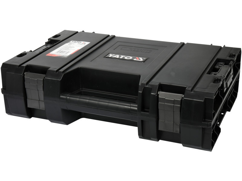 Szánva a hajtóművek szállítására és tárolására: fúrók, csavarhúzók, sarokcsiszolók, stb. Profiknak és barkácsolóknak egyaránt ajánlott. A YATO moduláris dobozrendszer része. Rögzíthető az YT-09166, YT-09162 és YT-09183 alaprendszer dobozához, valamint egy második, azonos hajtóművekhez szánt dobozhoz. A belső védőhab megóvja az eszközöket a sérülésektől és csökkenti azok elmozdulását .műszaki poliamidból készült strapabíró rögzítők és oldalsó csatok masszív, légmentes kialakítás ruganyos tömítés védi a doboz tartalmát a por és a víz ellen kézi hordozófogantyú összeilleszthető más rendszerdobozokkal két­dobozos optika érdekében .minden­oldalú használatra alkalmas kombinációk külső méretek: 450 x 322 x 126 mm, belső: 408 x 226 x 100 mm .