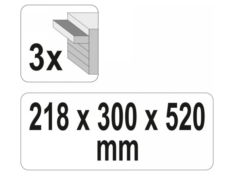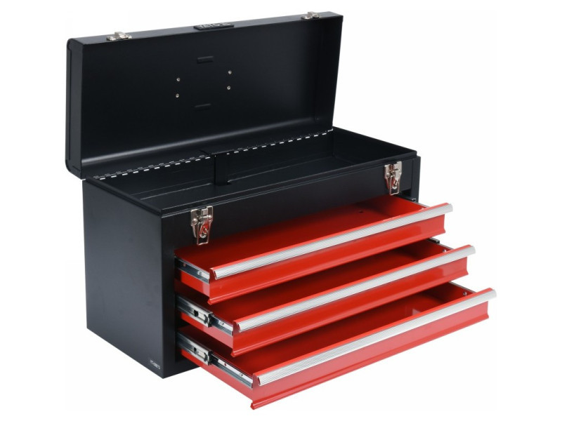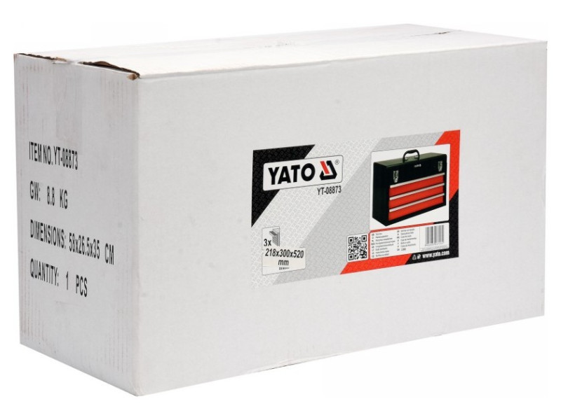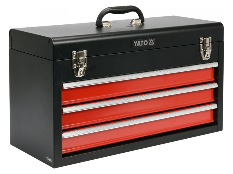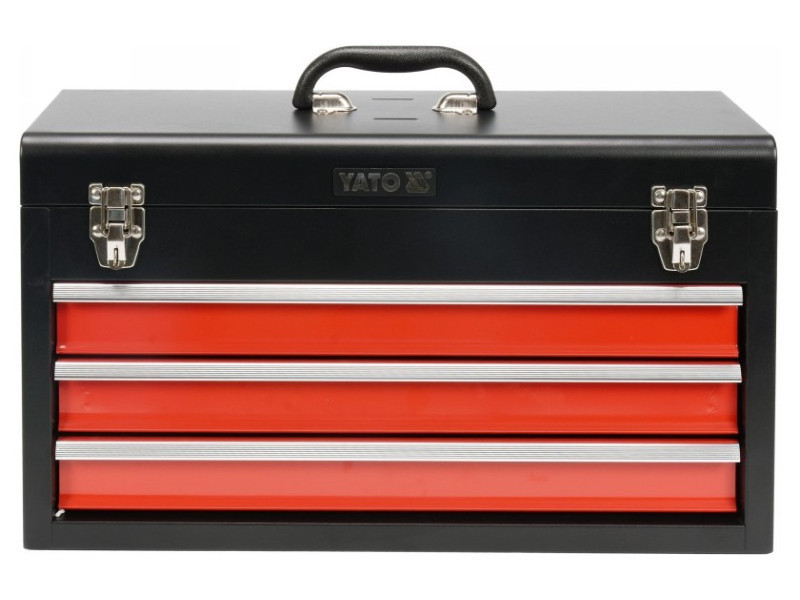 YATO műhelyeszközök tárolására szolgáló szerszámosláda, melyben fiókok találhatóak, amelyek fémgörgős kisiklásgátlókon futnak. Rendelkeznek továbbá további tárolórésszel a tetején, melyet fémkapcsokkal lehet lezárni.