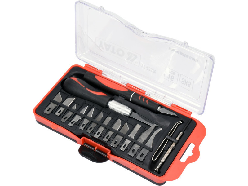 Yato márka precíziós kések készlete, melyeket elektronikában, modellezésben, művészeti műanyagokban stb. használnak. További információk: 16 darab, beleértve 2 gumírozott pengével ellátott késpenget 12 tartalék kés különböző formákban csipesz precíziós csavarhúzó SK5 szerszámacélból készült műanyag doboz
