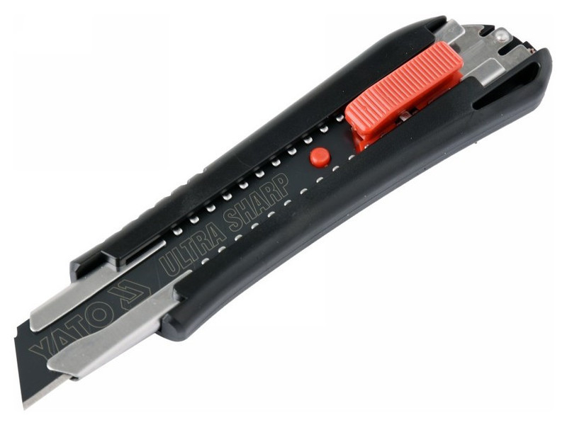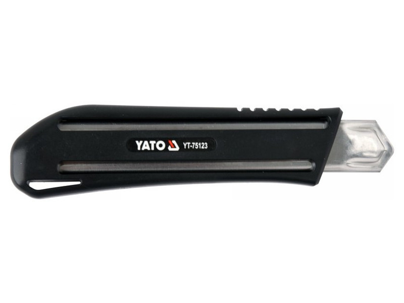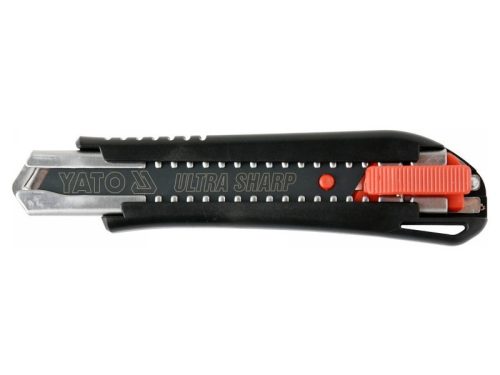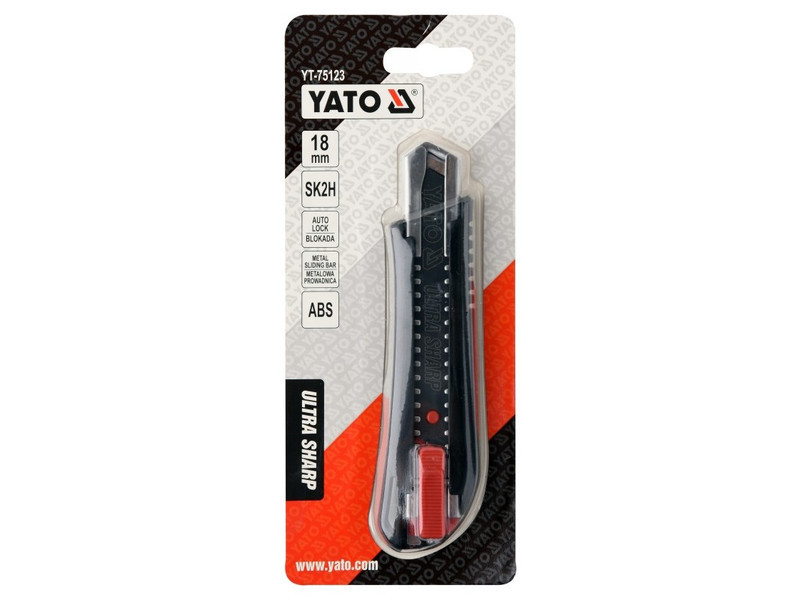 Yato YT-75123 18mm-es törhető pengéjű kés. Az Ultra Sharp SK2H acélból készült pengék, amelyeket speciális fekete bevonat borít, kivételes élességet garantálnak, az ellenálló ABS műanyag test. A nyél továbbá TPR-vel bevont, csúszásgátló fogás. Ez biztos fogást és a munkavégzés magas kényelmét biztosítja. A fém vezeték sima és problémamentes működést biztosít. Emellett felszerelt "Auto Lock" rendszerrel, ami védi a pengét a véletlen kinyúlás vagy behúzás ellen munka közben, 20N erőt áll ki. Az "Auto Lock" rendszernek köszönhetően a kés tökéletes vastag anyagok vágására vagy szűk részekben, ahol fennáll a penge beragadásának veszélye.