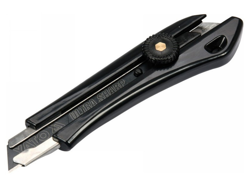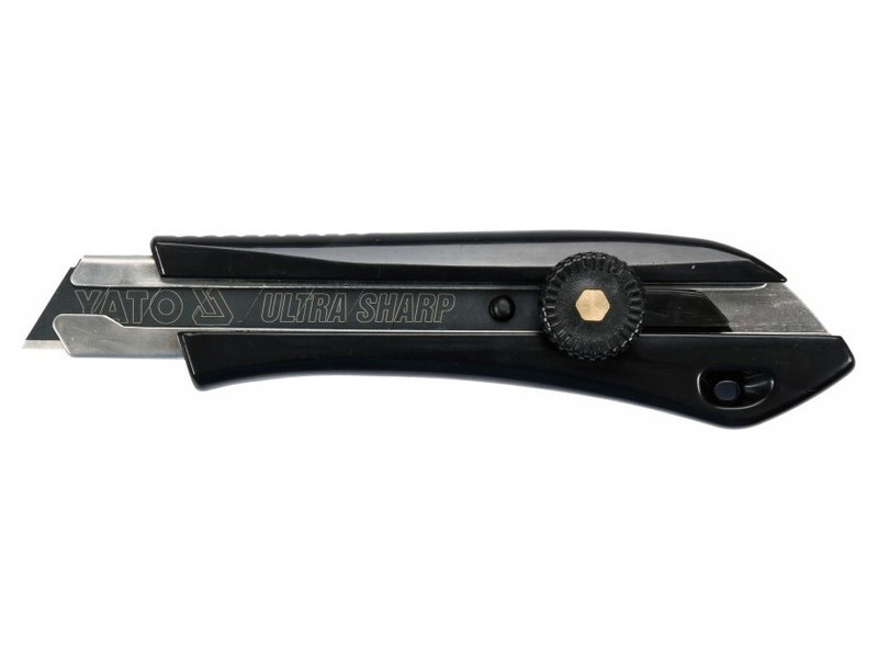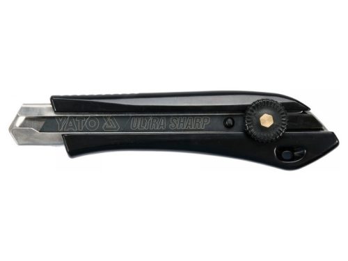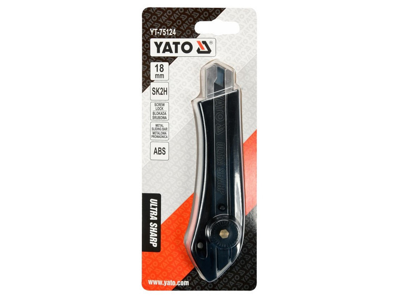Yato YT-75124 kés 18mm törhető pengevel. A pengék Ultra Sharp SK2H acélból készültek, amit speciális fekete bevonat fedi, garantált rendkívüli élesség, a test ellenálló ABS műanyagból készült. A fogantyút továbbá TPR-ből készült csúszásgátló bevonat fedi. Ez biztos fogást és nagy munkakényelmet biztosít. A fém útmutató sima és problémamentes működést biztosít. Ezenkívül felszerelték "Auto Lock" rendszerrel, ami megvédi a pengét a véletlen kihúzás vagy visszahúzás ellen munka közben, 20N terhelhetőséggel. Az "Auto Lock" rendszernek köszönhetően a kés tökéletes vastag anyagok vágására vagy szűk részekben, ahol a penge elakadásának veszélye áll fenn.