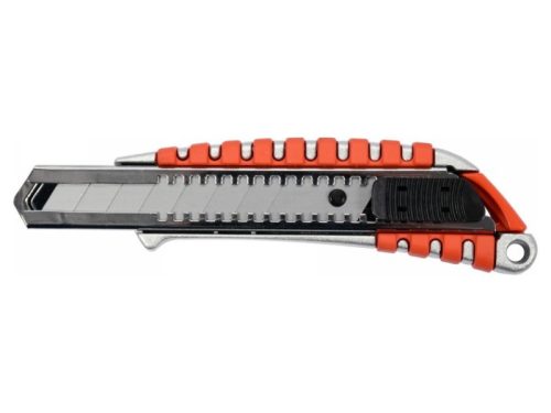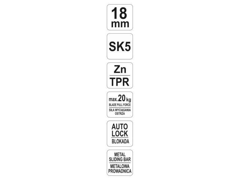 18mm-es eltörhető pengéjű kés. A kés teste speciális cinkötvözetből készült, amely hosszú élettartamot és ellenállást a mechanikai sérülésekkel szemben biztosít. Az ergonomikus nyél továbbá TPR-ből készült csúszásgátló bevonattal is ellátott. Ez biztos fogást és magas kényelmet biztosít. A fém vezetősín gond nélküli, sima működést biztosít. Továbbá "automatikus zár" rendszerrel rendelkezik, amely megvédi a pengét a véletlen kilövés vagy visszahúzás ellen munka közben, 20N-ig terjedő erővel szemben. Az "automatikus zár" rendszernek köszönhetően a kés tökéletes vastag anyagok vágásához vagy szűk résekben, ahol fennáll a veszélye a penge elakadásának. A kés pengéje SK5 acélból készült, amely nagyon jó vágási teljesítményt és hosszú élettartamot biztosít. Használati figyelmeztetések: Figyelem! Mindig használjon személyes védőfelszerelést a munka során.