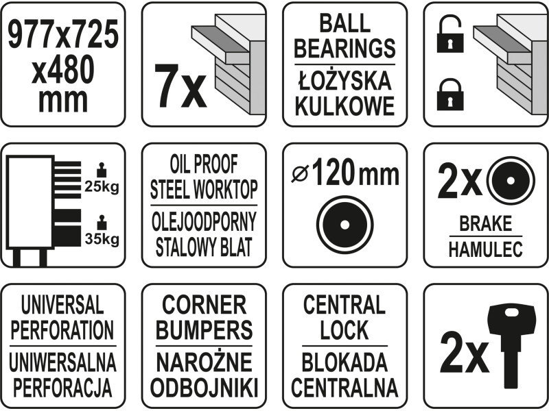 Az új YT-09032 szervizszekrény egyedi kialakítással rendelkezik, amelynek mechanizmusa megakadályozza, hogy egyszerre több fiókot nyissanak ki. Minden fiók simán működik a speciális, csapágyazott síneknek köszönhetően. Az egész egységet központi zár védi.