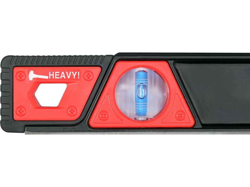 Robusztus, ütésálló alumínium lézer szintező. Két nagy fogantyú teszi könnyűvé a mérések végzését. A szintező végét rugalmas ütésálló ütközők védelmezik, lehetővé téve a kalapáccsal való ütést. A szintező három buborékkal van felszerelve: függőleges, vízszintes, 45 fokos. Az esztergált alapon 5 mágnes található.