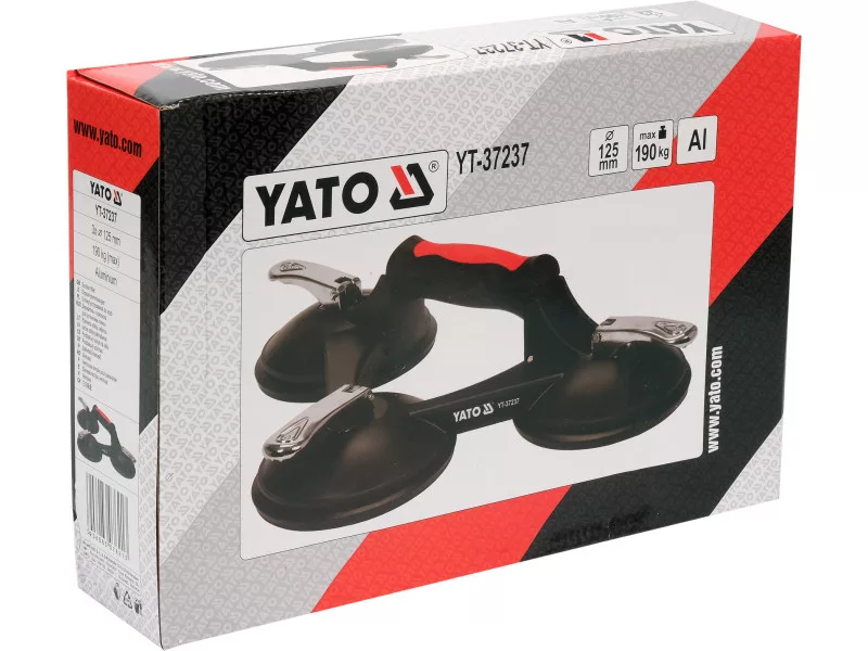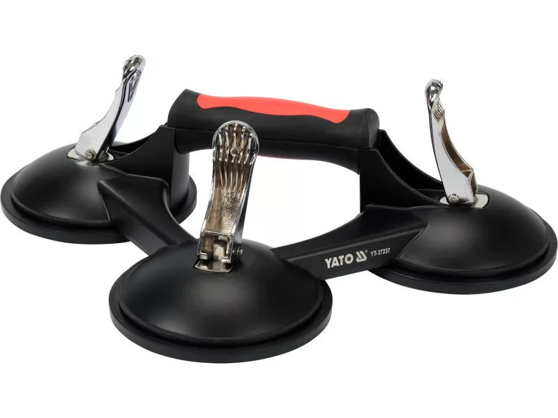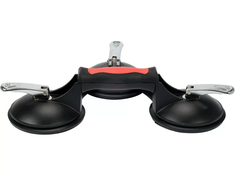 Üvegmozgató fogantyú - hármas. A fogantyú teste mechanikai sérülésekkel szemben ellenálló alumíniumból készül. Ergonomikus, csúszásgátló 2K műanyag borítású fogantyú. A fogantyún három lapos gumi tapadókorong található, melynek átmérője 125 mm. Méretei 345 x 282 x 123 x 7 mm, a záró gombok cinkötvözetből készültek. Terhelhetősége 190 kg. A fogantyút más sima felületű lapos elemek, például lemezek, táblák, laminált lapok stb. szállítására is lehet használni. A fogantyút más sima felületű lapos elemek, például lemezek, táblák, laminált pultok stb. szállítására is lehet használni.