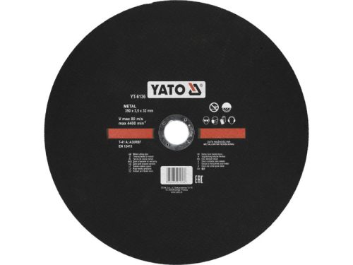 Fémvágó korong a YATO márkától, kiváló minőségű abrazív anyagból készült, megfelelő keménységgel és szemcsemérettel.