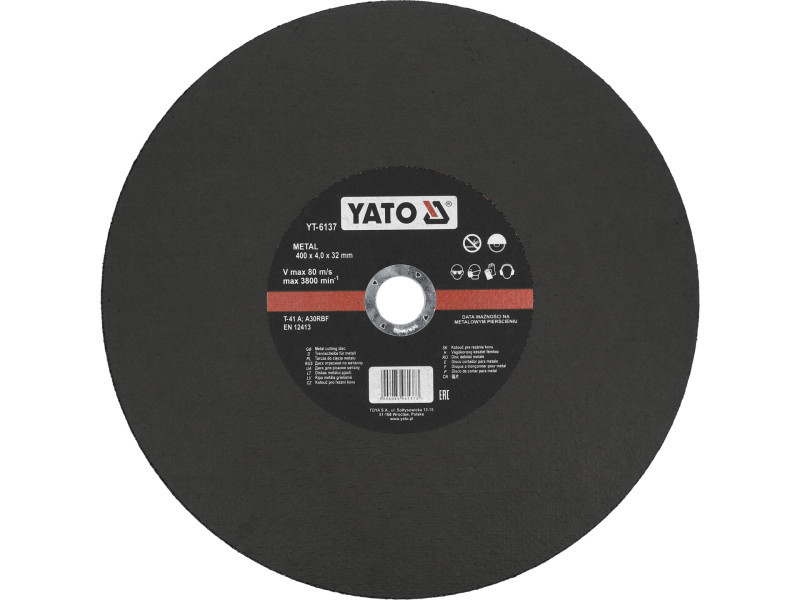 Fémdaraboló korong a YATO márkától, magas minőségű, megfelelő keménységű és szemcseméretű anyagból készült. a korongra gyantakötésű, üvegszállal megerősített (RBF szimbólum) Professzionális használatra tervezve az iparban és a kézműiparban. A korong ipari és kézműipari használatra készült.
