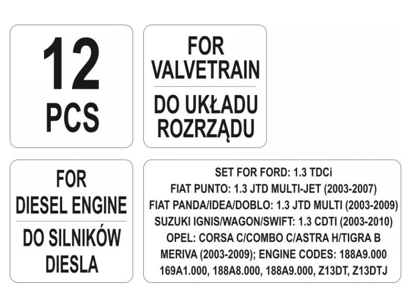 Professzionális dízel motor szelepemelő szerviz készlet.tartalmazza a GMP beállító eszközt, a vezérműtengely eszközt, a feszítő görgőtűt és a rögzítő csavartkényelmes hordtáskában kaphatóDízel motorokhoz:Ford: 1.3 TDCiFiat Punto: 1.3 JTD MULTI-JET (2003 - 2007)Fiat Panda/Idea/Doblo: 1.3 JTD Multi (2003 - 2009)Suzuki Ignis/Wagon/Swift: 1.3 CDTI (2003 - 2010)Opel Corsa C/Combo C/Astra H/Tigra B/ Meriva (2003 - 2009)Motorok kódokkal: 188A9.000. 169A1.000, 188A8.000, 188A9.000, Z13DT, Z13DTJ Használati figyelmeztetések: Figyelem! Mindig használjon személyes védőfelszerelést munka közben.