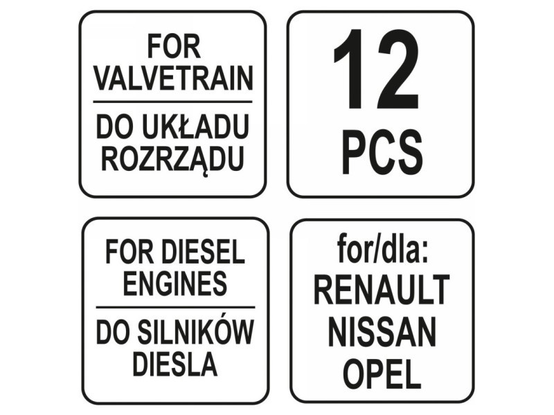Professzionális 12 darabos készlet, kifejezetten dízelmotorok szelepvezérlésének szervizelésére tervezve. Ajánlott szakosodott autószervizek részére.Renault, Nissan és Opel autókhoz tervezvepraktikus tokban csomagolva Használati figyelmeztetések: Figyelem! Munka közben mindig használjon személyes védőfelszerelést.