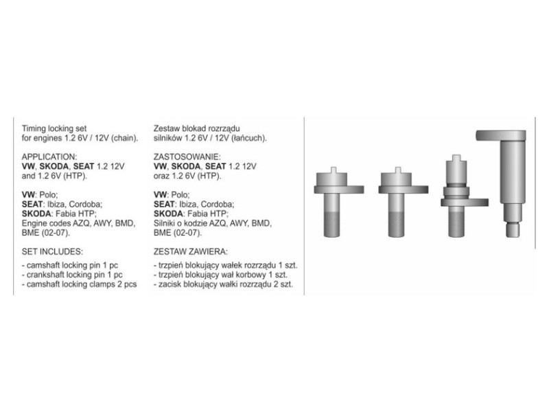 Professzionális szett a VW, Skoda, Seat 1.2 12V és 1.2 6V (HTP) autók benzinmotorjának szelephajtómű-szervizeléséhez. Használati figyelmeztetések: Figyelem! Mindig használjon személyes védőfelszerelést munka közben.