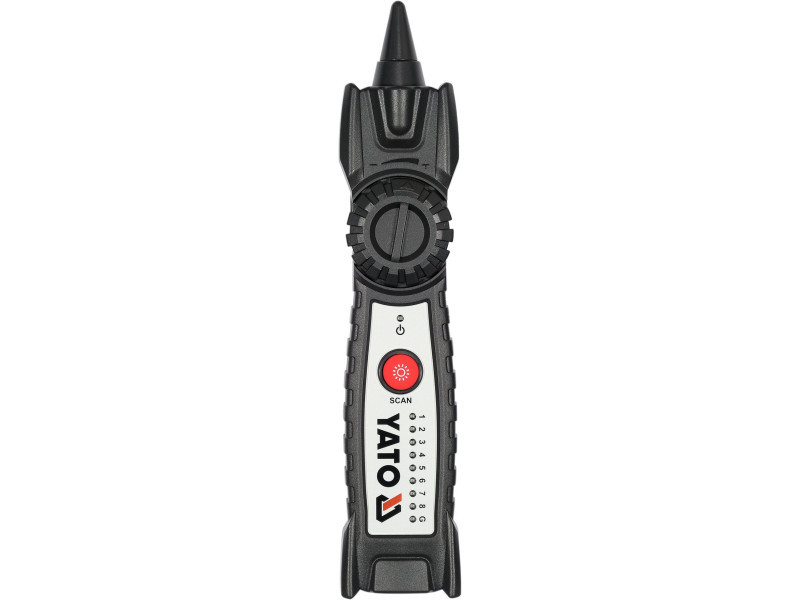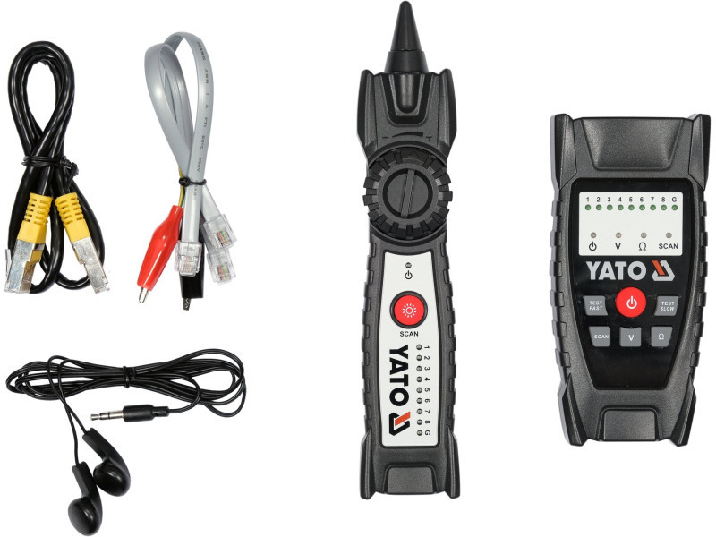 A YT-73137 kábelkereső egy vezetékellenőrző és lokalizáló eszköz. Egy falban lévő kábel útvonalának megállapítására, egy szerver szobában lévő hálózati kábel azonosítására, egy autó elektromos rendszerében lévő szakadás lokalizálására, egy RJ-45 kábel csatlakozásainak sorrendjének ellenőrzésére és egy telefonvonal állapotának ellenőrzésére használják.Két eszközből áll: egy adóból és egy vevőből. Az adót a keresett kábelhez csatlakoztatják, majd a SCAN funkció aktiválása után egy a vevő által ismert frekvencián küld jelzést. A vevő vezeték nélkül képes elkapni a jelet akár több centiméterre* is a keresett kábeltól. Zavarmentes. A vevő által fogadott jelet zaj- és recsegésmentes hanggá alakítja át. Az adó teljesítménye lehetővé teszi, hogy a jel minimum 1 kilométer távolságra legyen átvihető a vezetékben. A vevőn található beépített jack aljzat lehetővé teszi, például a mellékelt fülhallgató csatlakoztatását. ház anyaga: ABS állítható jelkövetési érzékenység/hangosság adó méretei és súlya: 63 x 134 x 31 mm / 138 g vevő méretei és súlya: 40 x 200 x 32 mm / 120 g az adó tápellátása: 3 x AAA - 1.5V elemek vevő tápellátása: 6F22 - 9V elem alacsony akkumulátor töltöttségi jelzés Funkciók: kábel helyének és útvonalának meghatározása kábelben lévő szakadás lokalizálása csatlakozások sorrendjének ellenőrzése RJ45 kábelbentelefonvonal feszültségének ellenőrzése feszültség polaritásának ellenőrzése telefonvonalban rövidzárlat jelenlétének ellenőrzése A falban lévő vezetékek lokalizálása, többek között biztonsági okokból, az adott vezetékben lévő hálózati feszültség nélkül kell, hogy történjen. *A vevő erősebb jelet fog elkapni, ha az adó kábelének egyik krokodil csipeszét földre kötik. A föld lehet a házi villamos hálózat földvezetéke vagy, más lehetőség hiányában, a testünk amely érintkezik a padlóval. Belső tesztek igazolták a kábelben továbbított jel vételét 15 cm távolságról a vevőtől (mérés akadály nélkül a vevő és a kábel között).