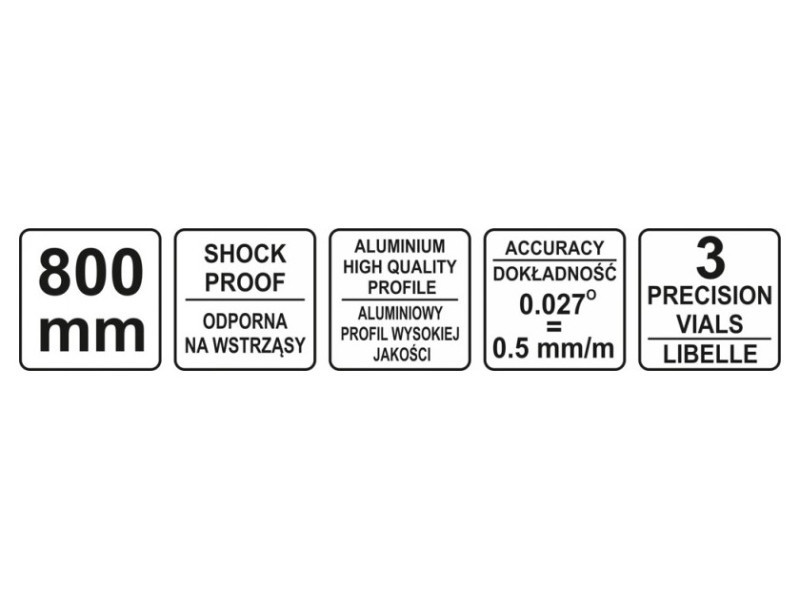 Alumínium szintező, 800 mm, 3 libella, két fogantyú, 0,5 mm/m pontosság