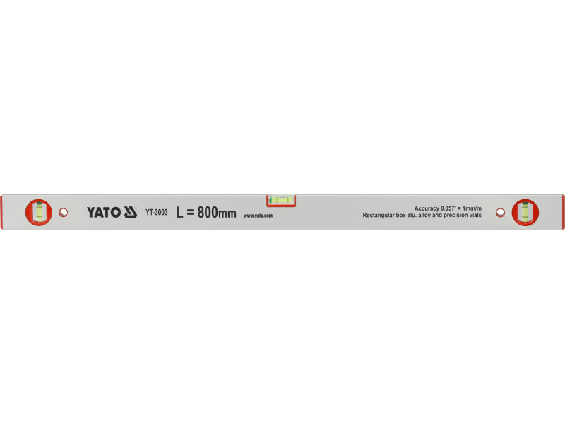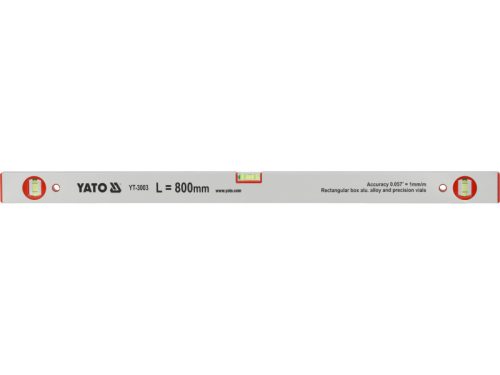 Alumínium szintező, 3 libella 800 mm   ütközés és sérülésálló test 1.5 mm vastag alumínium profilból készült. pontos, tartós libella rögzítés és a test merevsége garantálja a szintjelzők magas pontosságát és ismételhetőségét. A védővégek, amelyek megvédik a szintezőket a sérülésektől, nagy ütésállóságú műanyagból készülnek   Pontos mérésekhez építési és befejező munkák során.