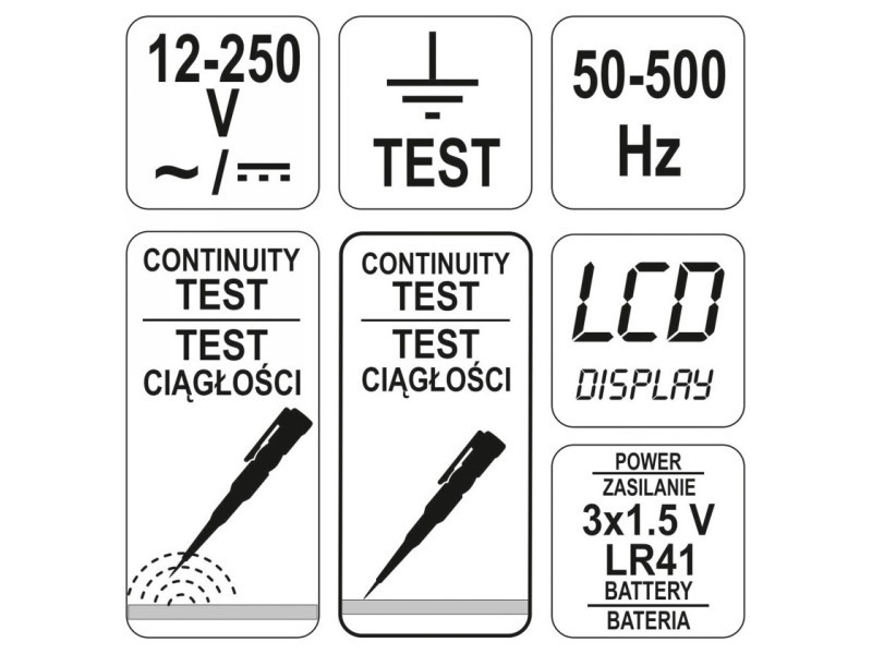 A YT-28630 elektromos jelző LCD kijelzővel lehetővé teszi az AC és DC elektromos feszültség jelenlétének megállapítását, az AC feszültség induktív módszerrel történő észlelését, valamint a kábel folytonosságának tesztelését. A feszültség jelenlétét az LCD kijelzőn és a világító diódán történő jelzés jelzi. Funkció, amely jelzi az AC és DC feszültséget. A kapcsolati módszer: 12-250VV TRANZISZTÁCIA AC induktív módszerrel: 12, 36, 55, 110 és 220VVSIGNALLÁCIÓ Világítás (LED) Tápegység: 3x1.5V; LR41METODA ÉRINTKEZÉSEK A DIRUCH ZÁRHATÓ. A kijelző megjeleníti a feszültségértékeket, a diódafoglalat pedig azt jelenti, hogy az elektromos áram átáramlik ezen az elemen. A jelző a tesztelt áramkör legmagasabb feszültségtartományát és az összes alacsonyabb sort mutatja, például amikor a 230V-os házaljzatból mérik a feszültséget, a kijelzőn megjelennek a [12, 36, 55, 110, 220] jelzések, ami azt jelenti, hogy a feszültség meghaladja a 220V-t. A kijelző a helyes feszültségtartományokat jelzi AC esetén a "kapcsolatteszt" mező tartásakor. DC esetén a helyes tartományok jelennek meg, ha a "indukciós teszt" mezőt tartjuk. Az indukciós -mérési módszer lehetővé teszi az AC feszültség észlelését szigetelt kábelben. Ehhez tegyünk egy ujjat az "indukciós teszt" mezőhöz, és közelítsük a barlangot a szigetelt kábelhez. A villám szimbólum jelenléte az LCD kijelzőn tájékoztat a feszültség jelenlétéről. Ez a módszer lehetővé teszi a r & oacute; érintés nélküli & none; Elektromos kábel szakadásának észlelése feszültségen. A megszakítás helyén a teszter abbahagyja a feszültség jelenlétének jelzését. A őrület folytonosságát úgy ellenőrizzük, hogy a teszter barlangját a kábel egyik végéhez csatoljuk, majd megtartjuk a "kapcsolatteszt" mezőt, fogjuk meg a kábel másik végét. A kevesebb LED azt jelenti, hogy a tesztelt kábel folytonos. & Nbsp