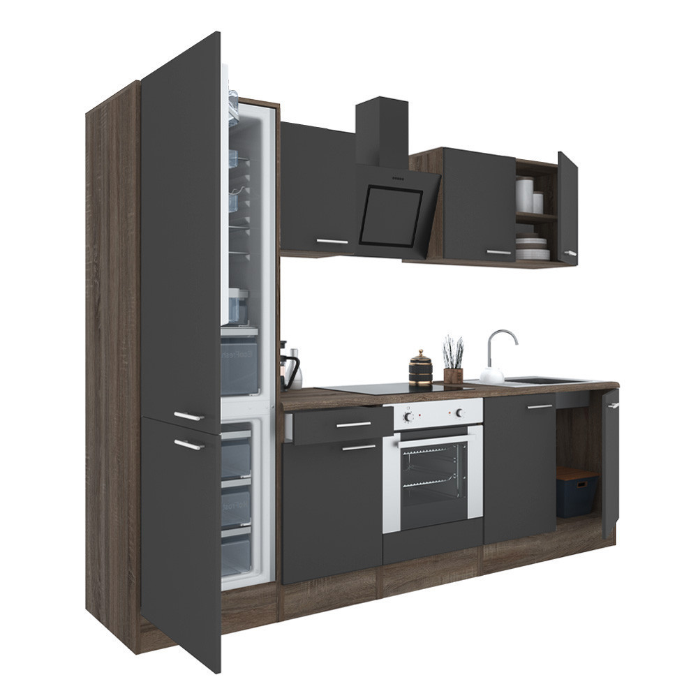 Yorki 270 konyhabútor yorki tölgy korpusz,selyemfényű antracit front alsó sütős elemmel alulfagyasztós hűtős szekrénnyel